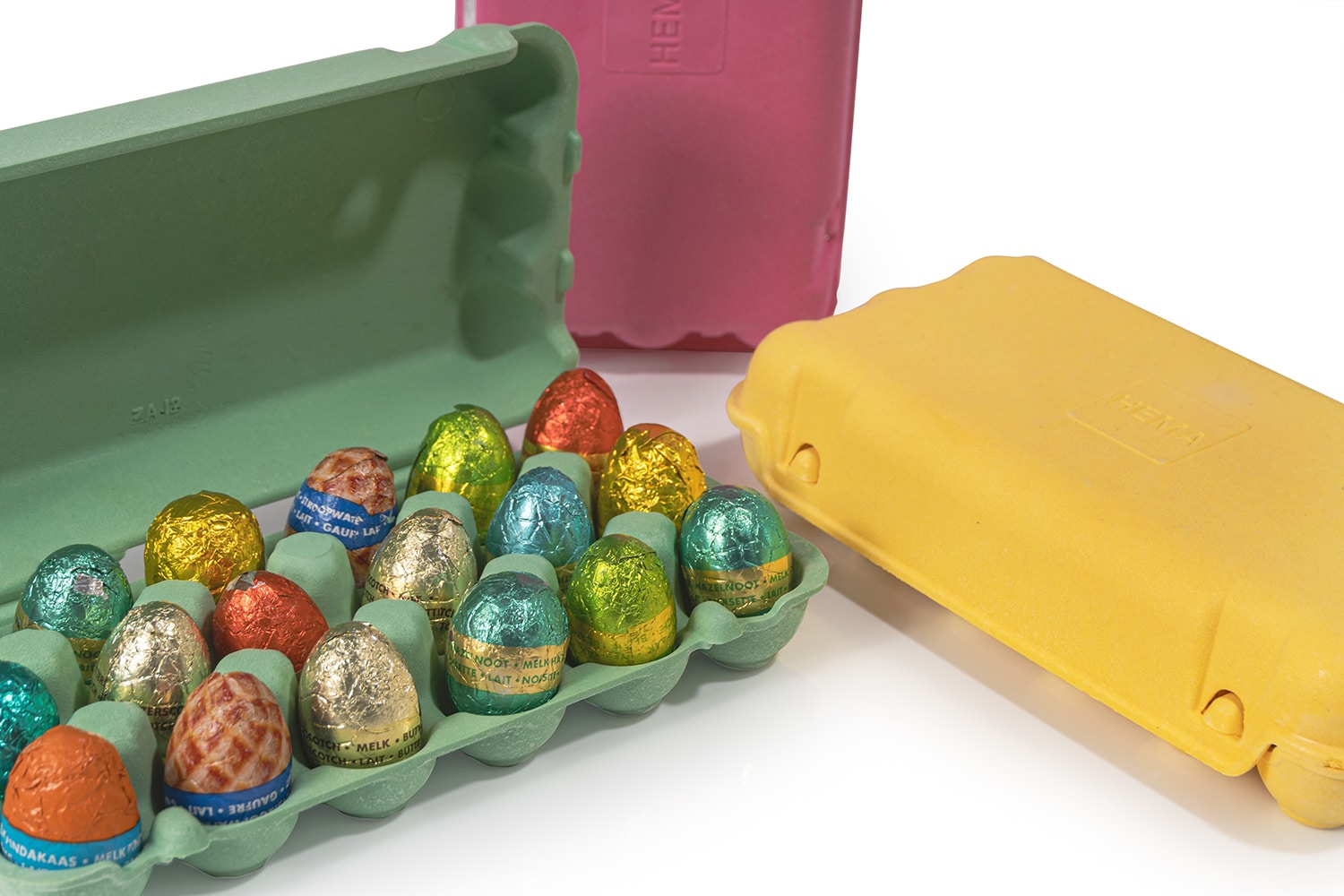 Pour la campagne annuelle de Pâques de HEMA, nous avons contribué à développer un concept d’emballage ludique pour leurs œufs en chocolat emblématiques. L’objectif : créer une alternative reconnaissable et durable au plastique, tout aussi festive. Le résultat est une série de boîtes à œufs colorées et moulées sur mesure, fabriquées à partir de PaperFoam® : légères, tactiles et entièrement compostables.