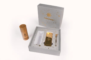 The PaperFoam® insert is designed to sit flush within the rigid box, keeping the overall structure clean and balanced. Cut-outs follow the contours of each product, ensuring both stability and visual alignment. The neutral tone of the material allows the fragrance bottles and branding elements to remain the focal point.