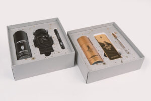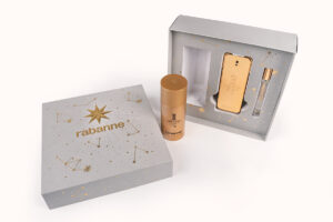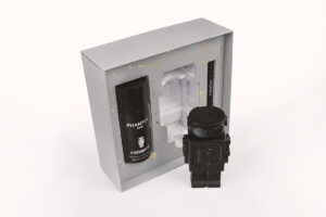 PaperFoam® developed a custom-molded insert tailored to the exact dimensions of the Rabanne gift sets. Each product component has its own dedicated position, preventing movement during transport and preserving the presentation at retail and during unboxing.